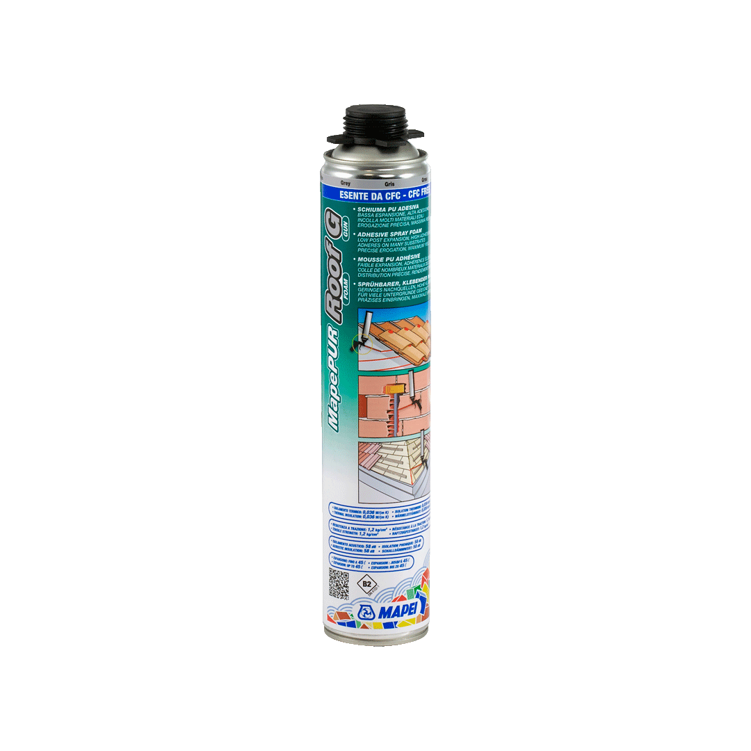 A MapePUR Roof Foam G egy egykomponensű, szürke színű, pisztolyos felhordású poliuretán ragasztóhab, amelyet kifejezetten építőelemek gyors rögzítésére és hézagok kitöltésére fejlesztettek ki.